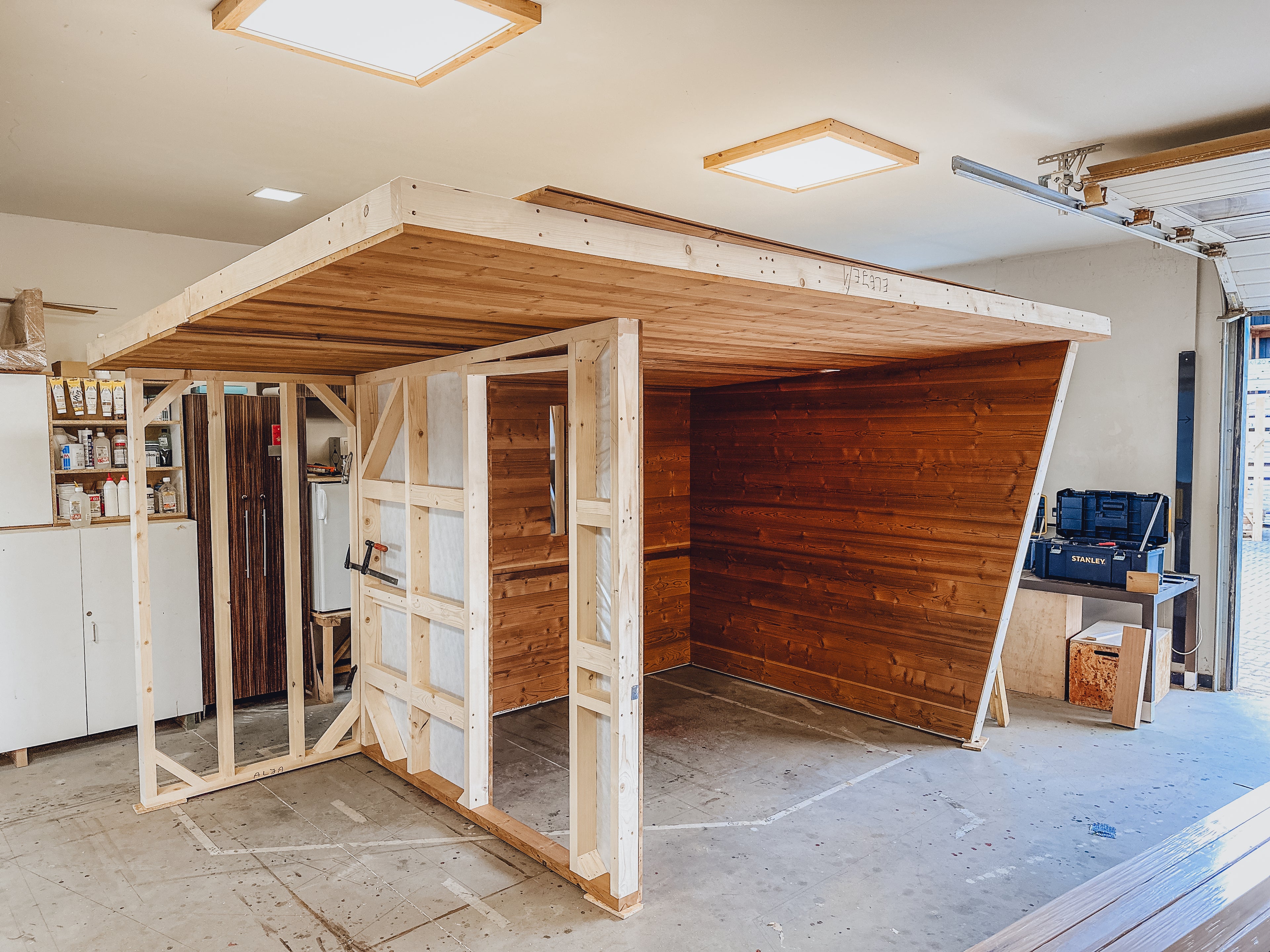 👉 Bevor du mit der Innenverkleidung beginnst, sollte der Innenraum aussehen wie eine „Alu-Box“ – so speichert die Sauna die Wärme deutlich effizienter.