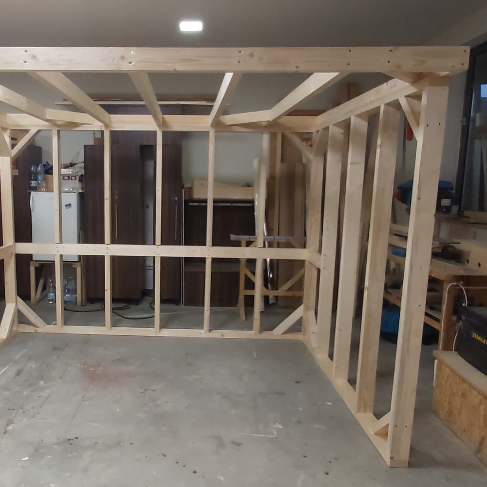 Wenn möglich, befestige ein oder mehrere Wände an der bestehenden Raumwand – das erhöht zusätzlich die Stabilität. Bei freistehenden (rundum begehbaren) Saunen ist ein massiver, stabiler Rahmen besonders wichtig. Verstärke außerdem die Bereiche, an denen später die Bänke oder Infrapaneele montiert werden.