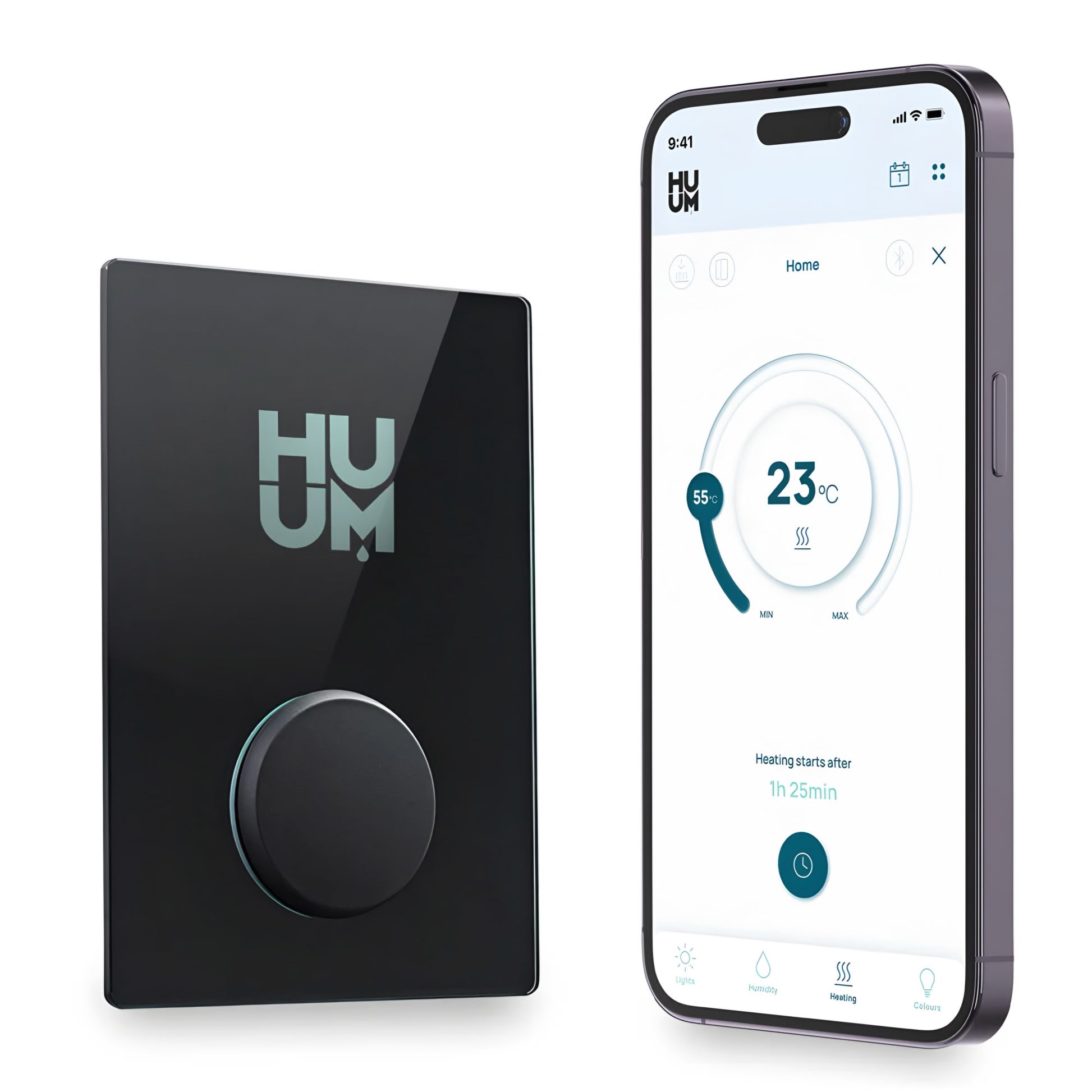 Steuerung vor Ort oder per Smartphone-App – Bedienbar direkt am eleganten Glas-Panel oder bequem von unterwegs mit der HUUM Mobile App (Android & iOS).